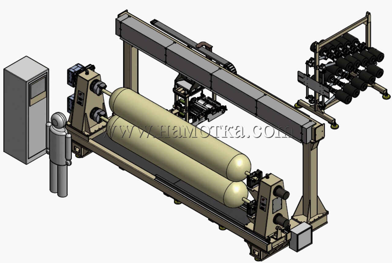 Высокопроизводительный двушпиндельный станок-полуавтомат с ЧПУ РПН2-550Ф3, на основе систем прямого привода, предназначен для радиально-перекрёстной намотки стеклопластиковых, металлокомпозитных баллонов и изделий сложной формы. Намотка в базовой комплектации возможна на металлический или полимерный лейнер. Так же, на данном станке возможна намотка стеклопластиковых и базальтопластиковых труб диаметром до 550 мм, длиной до 4500 мм.
